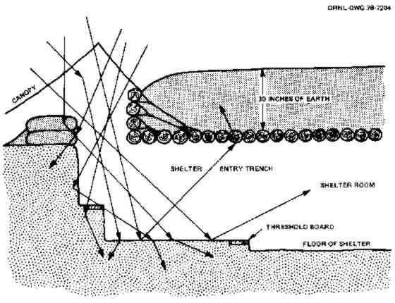 Fig. 5.5. Skyshine coming into a shelter through a vertical entry would be mostly absorbed while turning into and traveling down the entryway trench. ORNL.DWG 78-7204